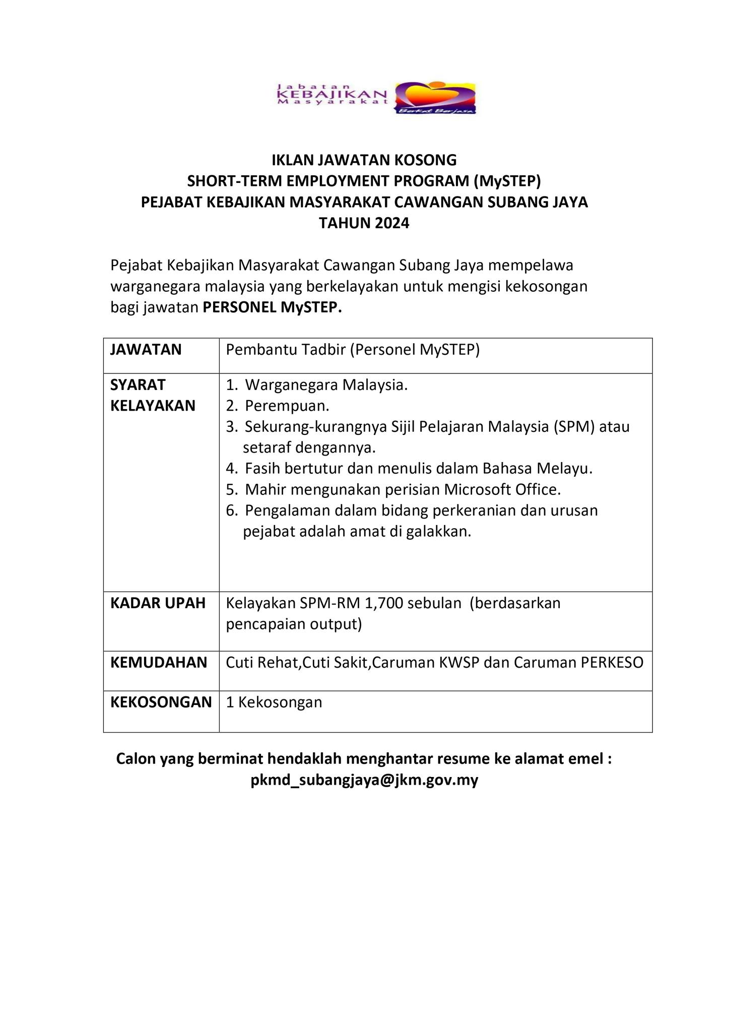 Iklan Jawatan Kosong Personel MySTEP di Pkmc Subang Jaya Like serta Ikut Facebook Kami, follow Chanel WhatsApp Jawatan Kosong & Telegram Portal SPA9 untuk capaian pantas kekosongan jawatan daripada kami sekarang. Klik Jawatan Disini