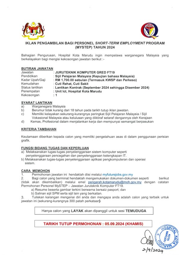 Iklan Jawatan Kosong Personel MySTEP Hospital Kota Marudu Like serta Ikut Facebook Kami, follow Chanel WhatsApp Jawatan Kosong & Telegram Portal SPA9 untuk capaian pantas kekosongan jawatan daripada kami sekarang. Klik Jawatan Disini