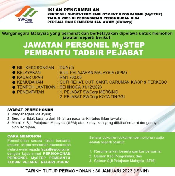Iklan Jawatan Kosong Personel MySTEP Perbadanan Pengurusan Sisa Pepejal & Pembersihan Awam (SWCorp)