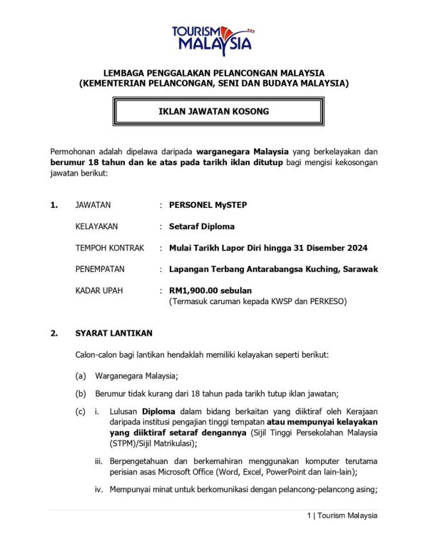 Iklan Jawatan Kosong Personel MySTEP Tourism Malaysia Like serta Ikut Facebook Kami, follow Chanel WhatsApp Jawatan Kosong & Telegram Portal SPA9 untuk capaian pantas kekosongan jawatan daripada kami sekarang. Klik Jawatan Disini