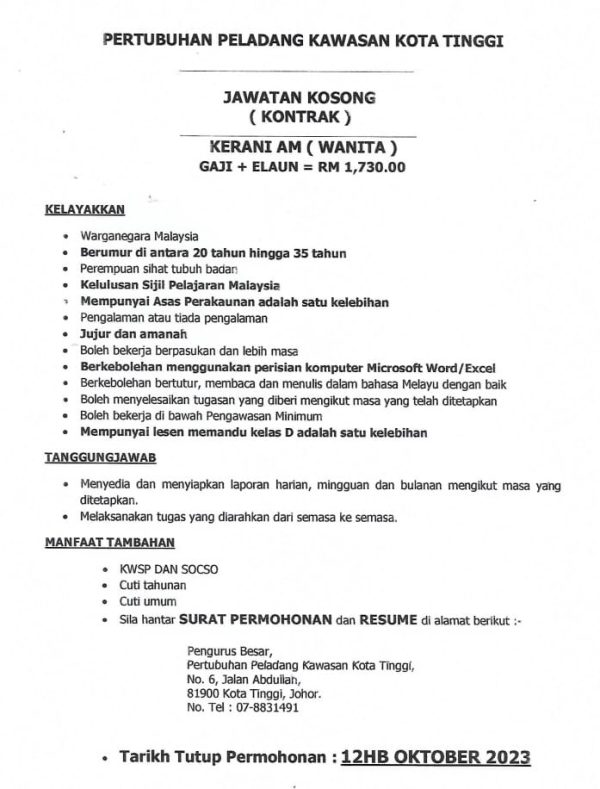 Iklan Jawatan Kosong Pertubuhan Peladang Kawasan Kota Tinggi Like serta Ikut Facebook Kami, follow Chanel WhatsApp Jawatan Kosong & Telegram Portal SPA9 untuk capaian pantas kekosongan jawatan daripada kami sekarang.