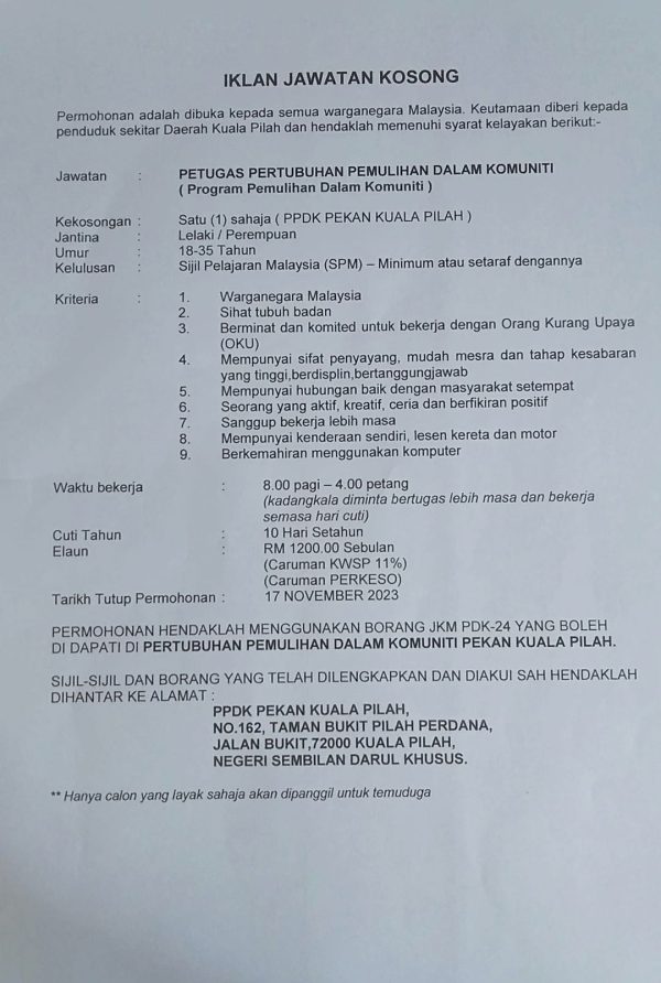 Iklan Jawatan Kosong Pertubuhan Pemulihan Dalam Komuniti (PPDK) Like serta Ikut Facebook Kami, follow Chanel WhatsApp Jawatan Kosong & Telegram Portal SPA9 untuk capaian pantas kekosongan jawatan daripada kami sekarang.