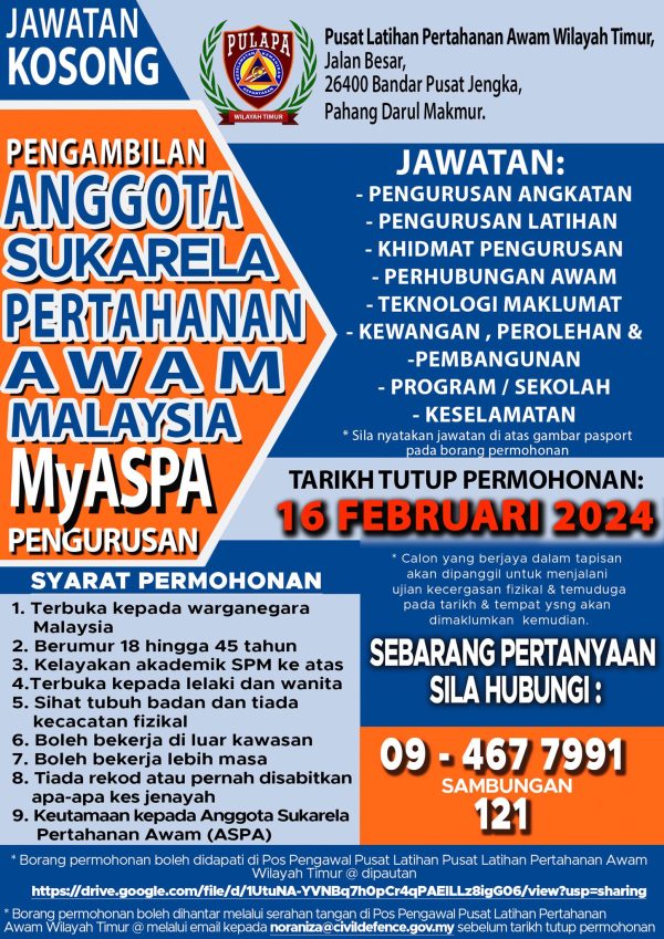 Iklan Jawatan Kosong Pusat Latihan Pertahanan Awam (PULAPA) Like serta Ikut Facebook Kami, follow Chanel WhatsApp Jawatan Kosong & Telegram Portal SPA9 untuk capaian pantas kekosongan jawatan daripada kami sekarang. Borang Jawatan