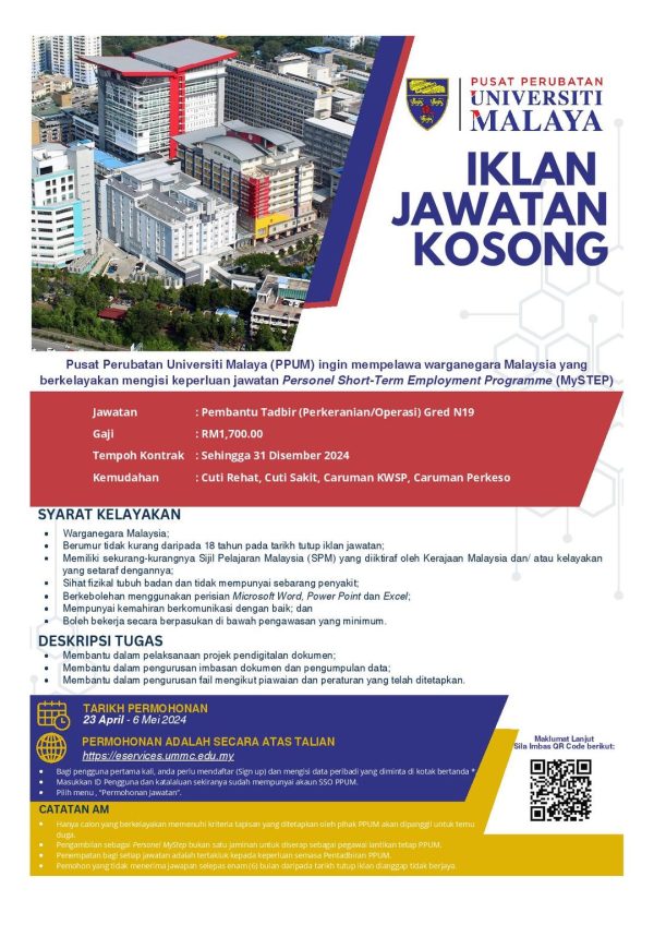 Iklan Jawatan Kosong Pusat Perubatan Universiti Malaya (PPUM) Klik Jawatan Disini Like serta Ikut Facebook Kami, follow Chanel WhatsApp Jawatan Kosong & Telegram Portal SPA9 untuk capaian pantas kekosongan jawatan daripada kami sekarang.