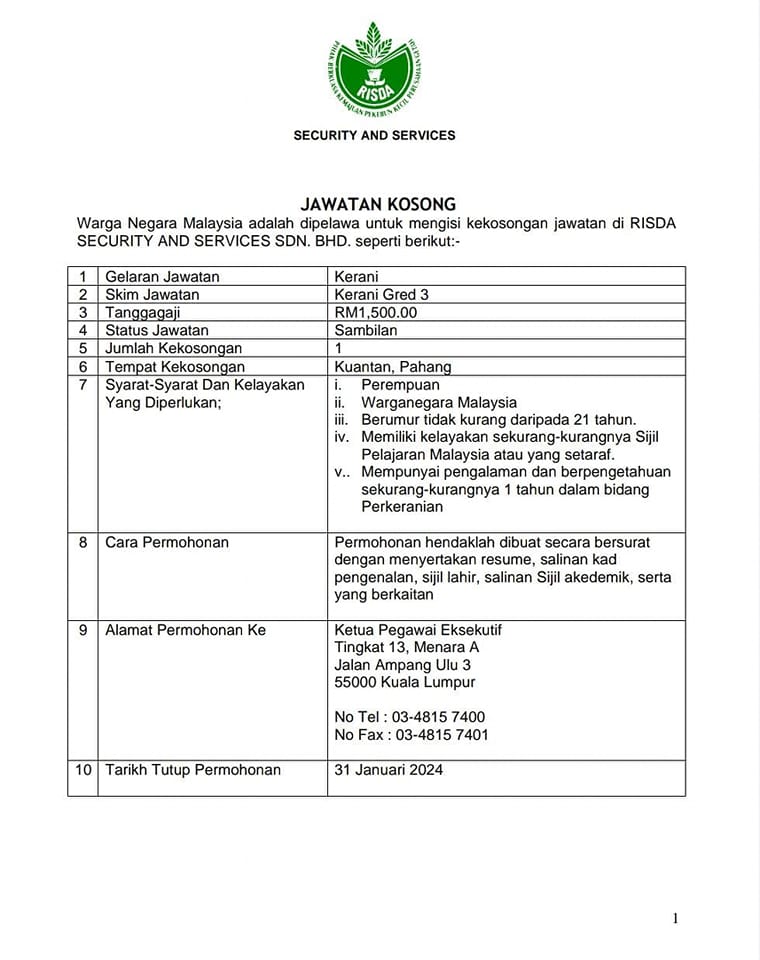 IKlan Jawatan Kosong RISDA Security And Services Sdn Bhd Like serta Ikut Facebook Kami, follow Chanel WhatsApp Jawatan Kosong & Telegram Portal SPA9 untuk capaian pantas kekosongan jawatan daripada kami sekarang.