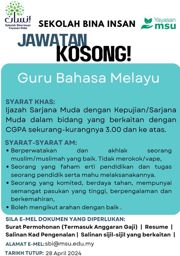 Iklan Jawatan Kosong Sekolah Menengah Bina Insan Yayasan MSU (SBI YMSU) Like serta Ikut Facebook Kami, follow Chanel WhatsApp Jawatan Kosong & Telegram Portal SPA9 untuk capaian pantas kekosongan jawatan daripada kami sekarang.