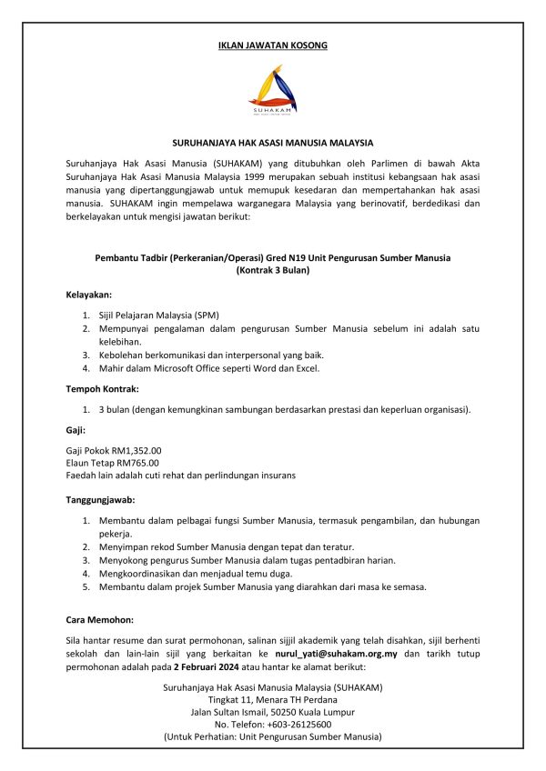 Iklan Jawatan Kosong Suruhanjaya Hak Asasi Manusia Malaysia (SUHAKAM) Like serta Ikut Facebook Kami, follow Chanel WhatsApp Jawatan Kosong & Telegram Portal SPA9 untuk capaian pantas kekosongan jawatan daripada kami sekarang. Klik Jawatan Disini