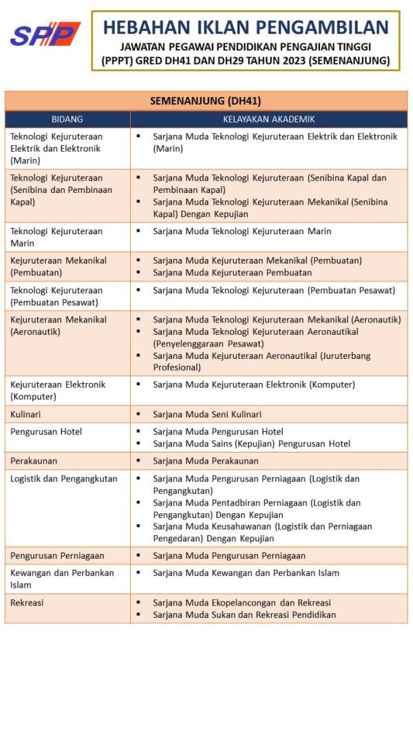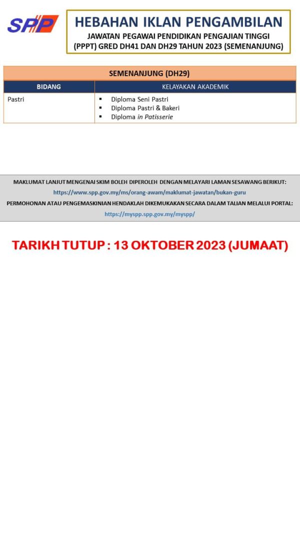 Iklan Jawatan Kosong Suruhanjaya Perkhidmatan Pendidikan (SPP) Like serta Ikut Facebook Kami, follow Chanel WhatsApp Jawatan Kosong & Telegram Portal SPA9 untuk capaian pantas kekosongan jawatan daripada kami sekarang. Klik Jawatan Disini