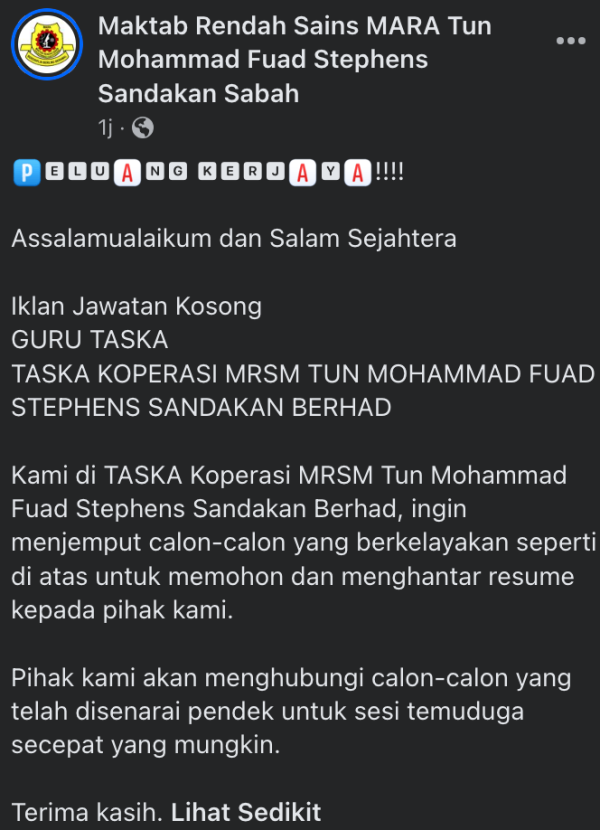 Iklan Jawatan Kosong Taska Koperasi MRSM Tun Mohammad Fuad Stephens Sandakan Berhad Like serta Ikut Facebook Kami, follow Chanel WhatsApp Jawatan Kosong & Telegram Portal SPA9 untuk capaian pantas kekosongan jawatan daripada kami sekarang.