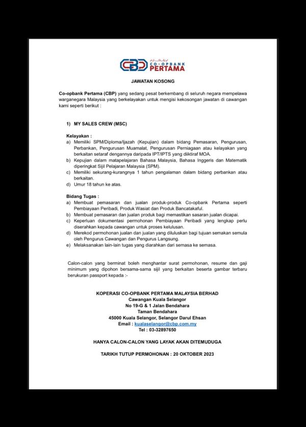Iklan Jawatan Kosong Terkini Co-opbank Pertama (CBP) Like serta Ikut Facebook Kami, follow Chanel WhatsApp Jawatan Kosong & Telegram Portal SPA9 untuk capaian pantas kekosongan jawatan daripada kami sekarang.