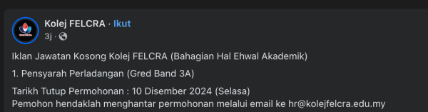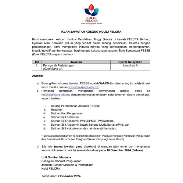 Iklan Jawatan Kosong Terkini Kolej FELCRA Like serta Ikut Facebook Kami, follow Chanel WhatsApp Jawatan Kosong & Telegram Portal SPA9 untuk capaian pantas kekosongan jawatan daripada kami sekarang. Klik Iklan Jawatan