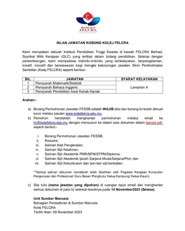 Iklan Jawatan Kosong Terkini Kolej FELCRA Like serta Ikut Facebook Kami, follow Chanel WhatsApp Jawatan Kosong & Telegram Portal SPA9 untuk capaian pantas kekosongan jawatan daripada kami sekarang.