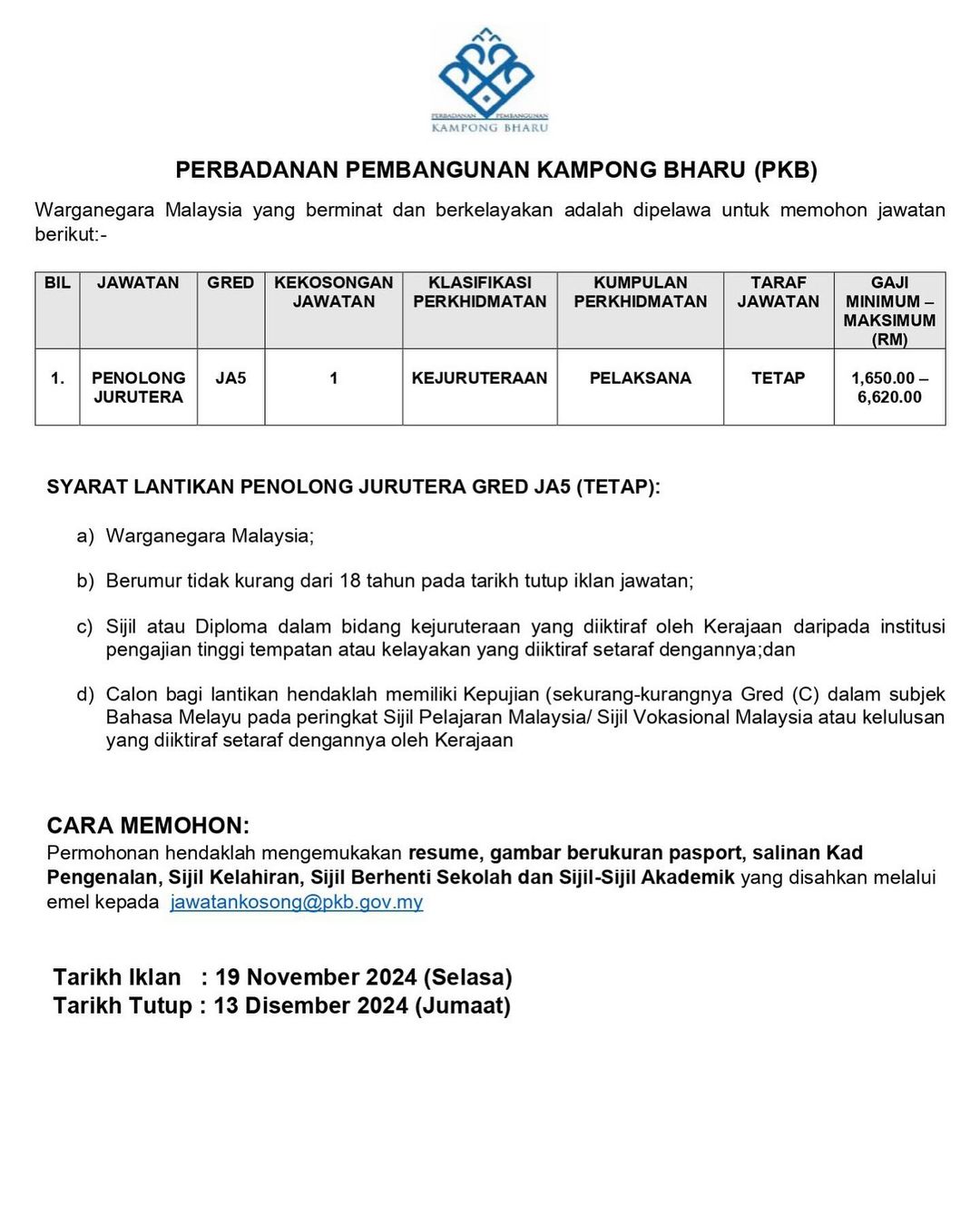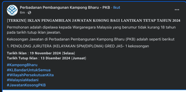 Iklan Jawatan Kosong Terkini Perbadanan Pembangunan Kampong Bharu (PKB) Like serta Ikut Facebook Kami, follow Chanel WhatsApp Jawatan Kosong & Telegram Portal SPA9 untuk capaian pantas kekosongan jawatan daripada kami sekarang. Klik Iklan Jawatan
