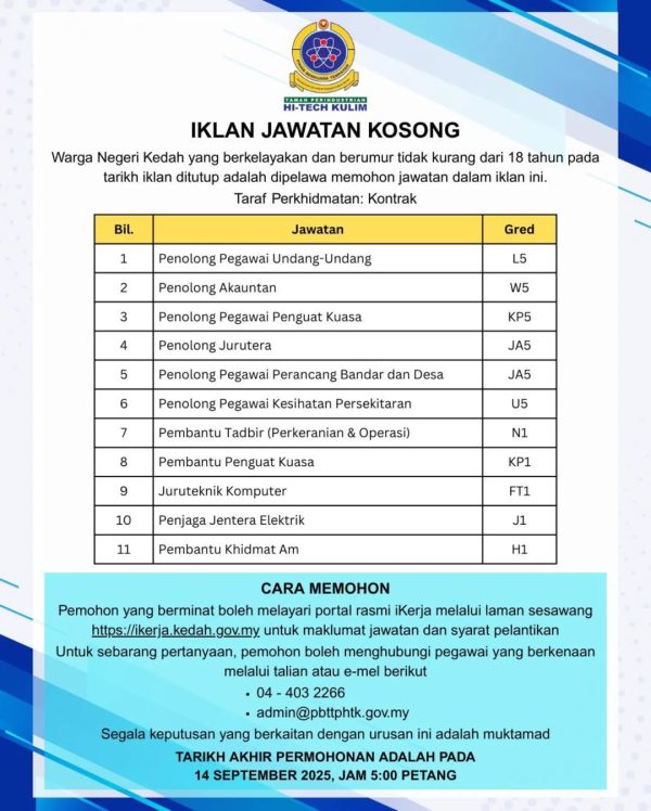 Iklan Jawatan Kosong Terkini Pihak Berkuasa Tempatan Taman Perindustrian Hi-Tech Kulim Klik Iklan Disini Like serta Ikut Facebook Kami, follow Chanel WhatsApp Jawatan Kosong & Telegram Portal SPA9 untuk capaian pantas kekosongan jawatan daripada kami sekarang.