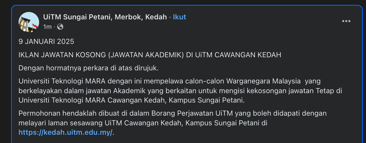 Iklan Jawatan Kosong Terkini Universiti Teknologi Mara (UiTM) Cawangan Kedah Like serta Ikut Facebook Kami, follow Chanel WhatsApp Jawatan Kosong & Telegram Portal SPA9 untuk capaian pantas kekosongan jawatan daripada kami sekarang. Klik Iklan Jawatan