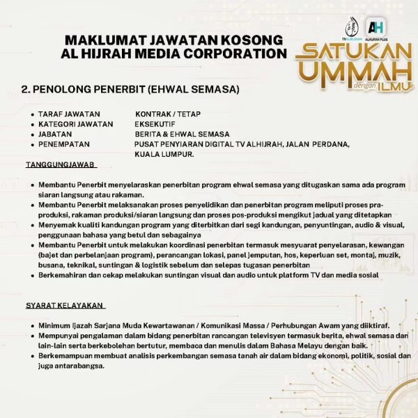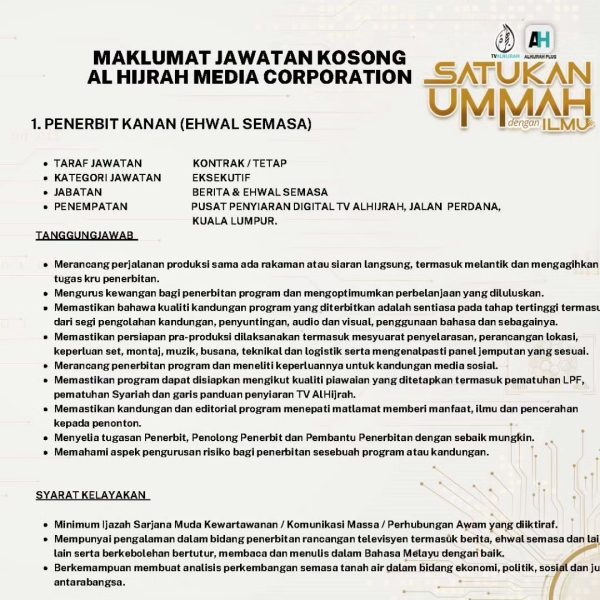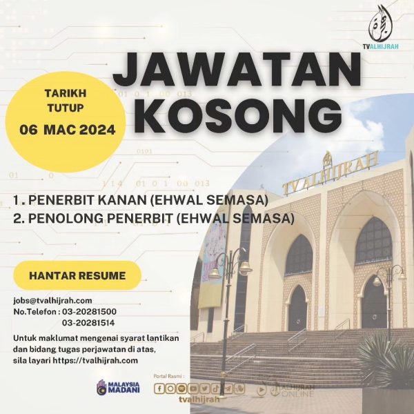 Iklan Jawatan Kosong TV AlHijrah Like serta Ikut Facebook Kami, follow Chanel WhatsApp Jawatan Kosong & Telegram Portal SPA9 untuk capaian pantas kekosongan jawatan daripada kami sekarang.