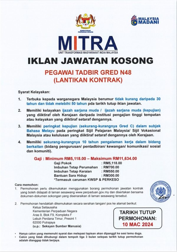 Iklan Jawatan Kosong Unit Transformasi Masyarakat India Malaysia (MITRA) Like serta Ikut Facebook Kami, follow Chanel WhatsApp Jawatan Kosong & Telegram Portal SPA9 untuk capaian pantas kekosongan jawatan daripada kami sekarang.
