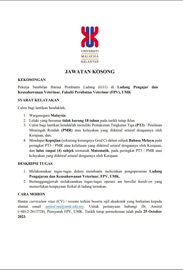 Iklan Jawatan Kosong Universiti Malaysia Kelantan (UMK) Like serta Ikut Facebook Kami, follow Chanel WhatsApp Jawatan Kosong & Telegram Portal SPA9 untuk capaian pantas kekosongan jawatan daripada kami sekarang.