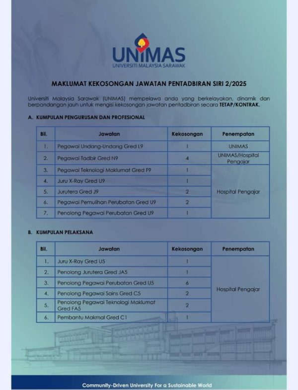Iklan Jawatan Kosong Universiti Malaysia Sarawak (UNIMAS) Like serta Ikut Facebook Kami, follow Chanel WhatsApp Jawatan Kosong & Telegram Portal SPA9 untuk capaian pantas kekosongan jawatan daripada kami sekarang. Klik Jawatan Disini