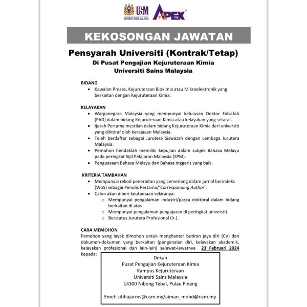 Iklan Jawatan Kosong Universiti Sains Malaysia (USM) Like serta Ikut Facebook Kami, follow Chanel WhatsApp Jawatan Kosong & Telegram Portal SPA9 untuk capaian pantas kekosongan jawatan daripada kami sekarang.