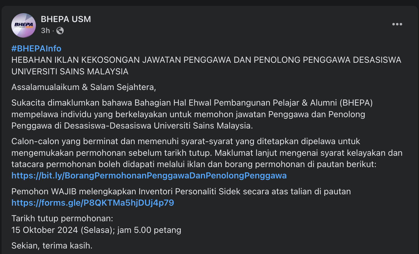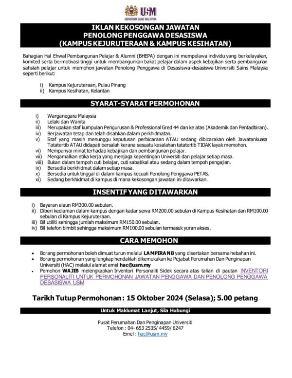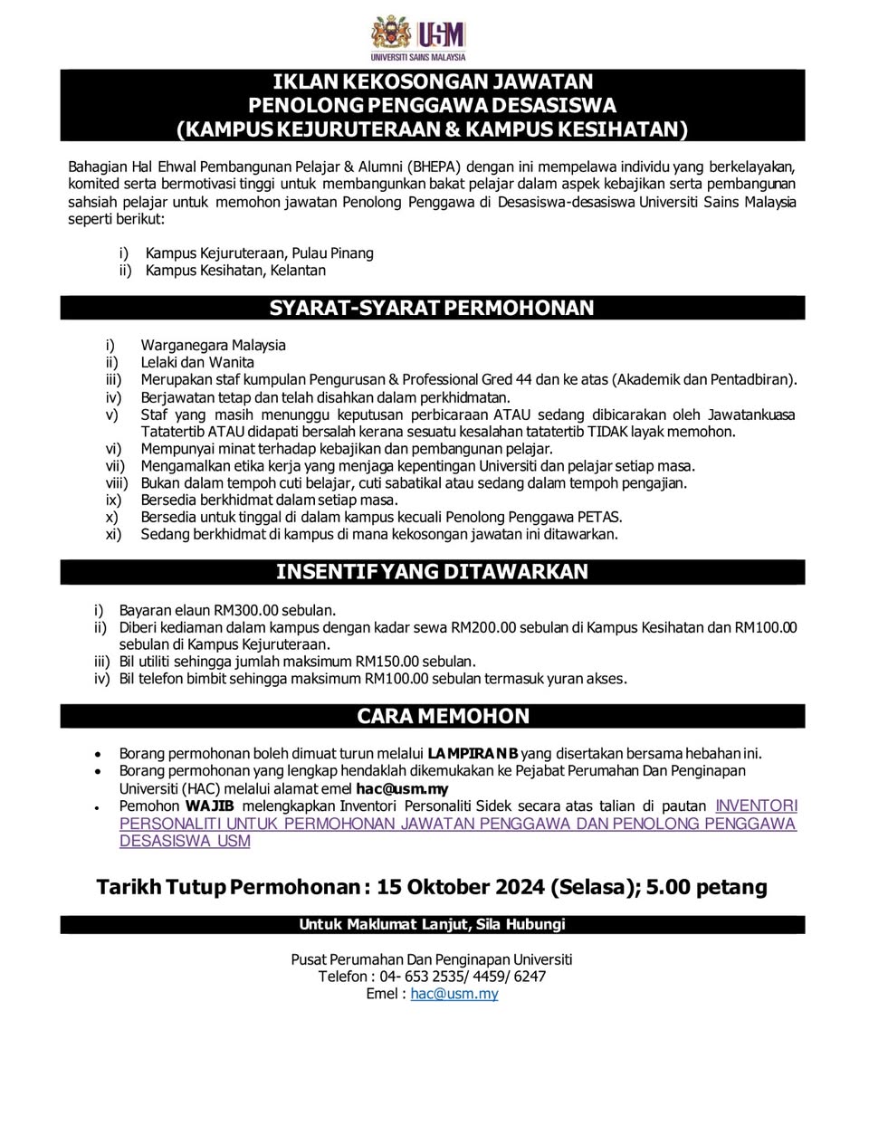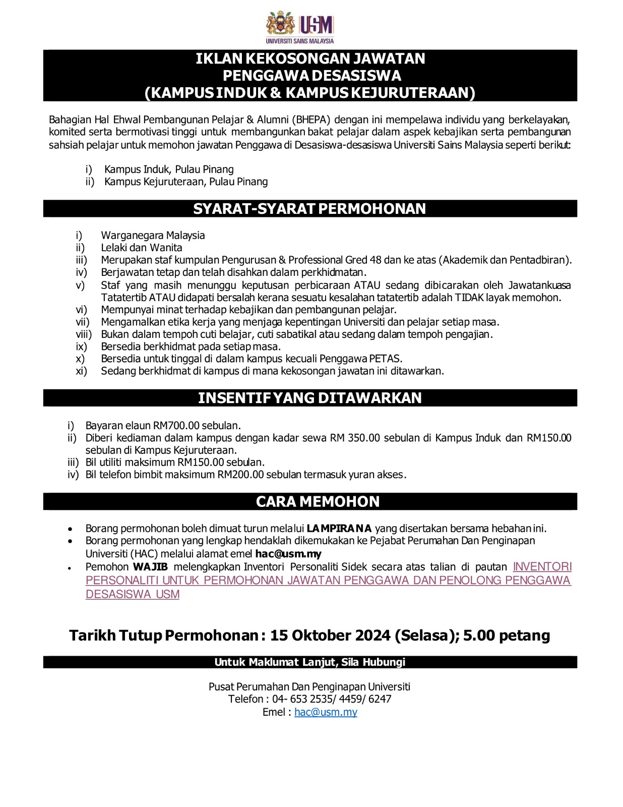 Iklan Jawatan Kosong Universiti Sains Malaysia (USM) Like serta Ikut Facebook Kami, follow Chanel WhatsApp Jawatan Kosong & Telegram Portal SPA9 untuk capaian pantas kekosongan jawatan daripada kami sekarang. Klik Jawatan Disini