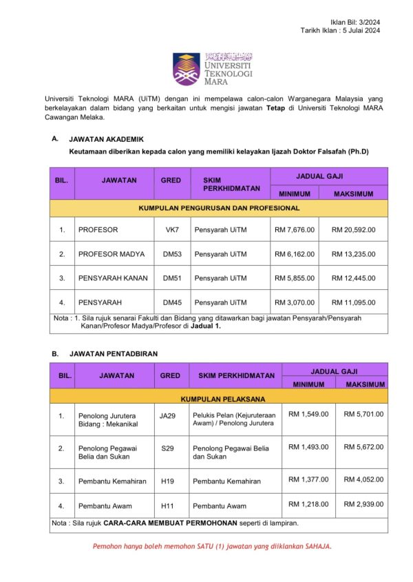 Iklan Jawatan Kosong Universiti Teknologi MARA (UiTM) Cawangan Melaka Like serta Ikut Facebook Kami, follow Chanel WhatsApp Jawatan Kosong & Telegram Portal SPA9 untuk capaian pantas kekosongan jawatan daripada kami sekarang. Klik Jawatan Disini