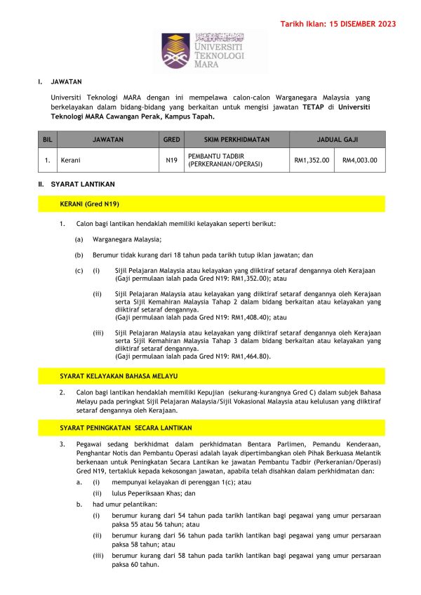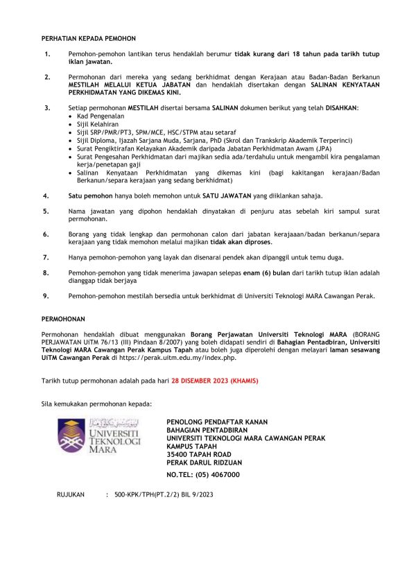 Iklan Jawatan Kosong Universiti Teknologi Mara (UiTM) Cawangan Perak, Kampus Tapah Like serta Ikut Facebook Kami, follow Chanel WhatsApp Jawatan Kosong & Telegram Portal SPA9 untuk capaian pantas kekosongan jawatan daripada kami sekarang.