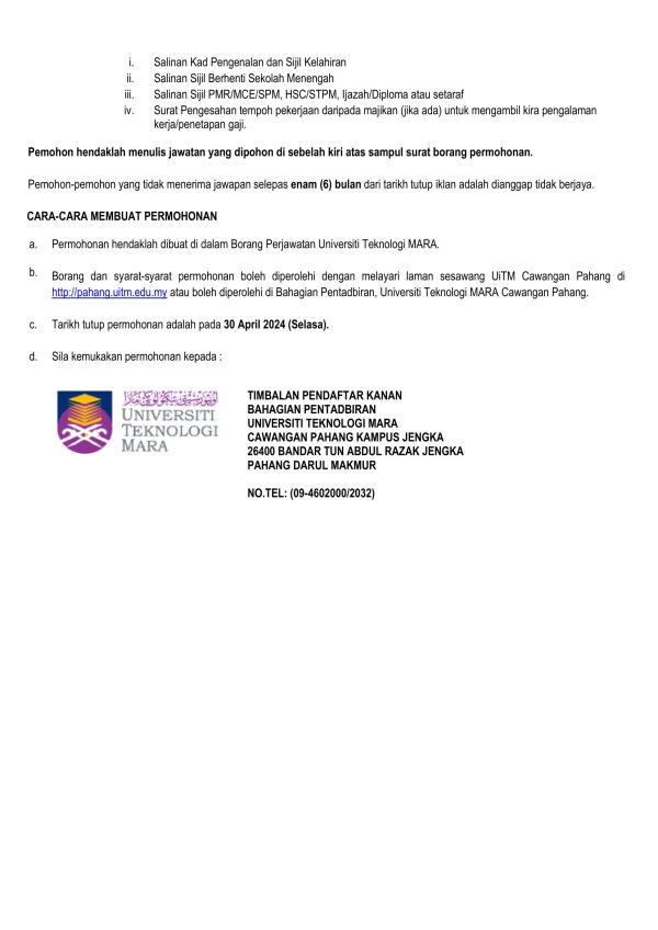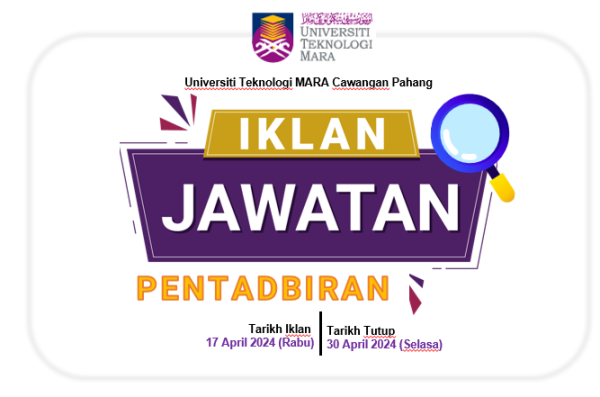 Iklan Jawatan Kosong Universiti Teknologi MARA (UiTM) Pahang Like serta Ikut Facebook Kami, follow Chanel WhatsApp Jawatan Kosong & Telegram Portal SPA9 untuk capaian pantas kekosongan jawatan daripada kami sekarang.