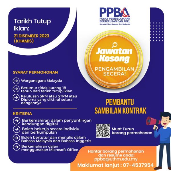 Iklan Jawatan Kosong Universiti Tun Hussein Onn Malaysia (UTHM) Like serta Ikut Facebook Kami, follow Chanel WhatsApp Jawatan Kosong & Telegram Portal SPA9 untuk capaian pantas kekosongan jawatan daripada kami sekarang. Klik Jawatan Disini