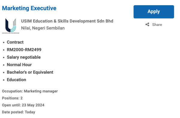 Permohonan jawatan ini boleh dibuat melalui Portal MyFutureJobs. Sila ke Portal MyFutureJobs dan Masukkan Kata Carian yang ingin dicari “USIM EDUCATION & SKILLS DEVELOPMENT SDN BHD” di bahagian carian untuk memohon jawatan yang diiklankan.