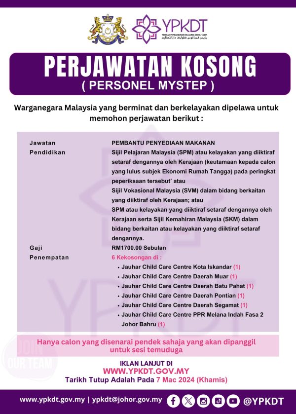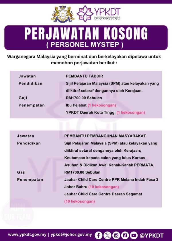 Iklan Jawatan Kosong Yayasan Pembangunan Keluarga Darul Ta’zim Like serta Ikut Facebook Kami, follow Chanel WhatsApp Jawatan Kosong & Telegram Portal SPA9 untuk capaian pantas kekosongan jawatan daripada kami sekarang.