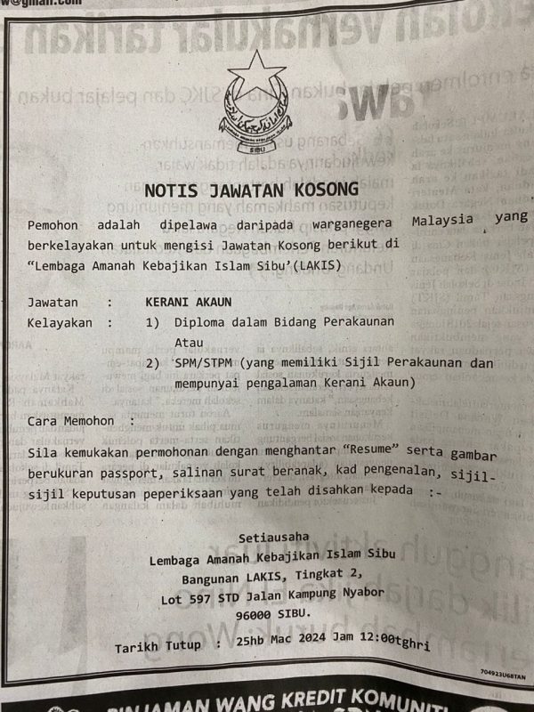 Iklan Jawatan Lembaga Amanah Kebajikan Islam Sibu (LAKIS) Like serta Ikut Facebook Kami, follow Chanel WhatsApp Jawatan Kosong & Telegram Portal SPA9 untuk capaian pantas kekosongan jawatan daripada kami sekarang.