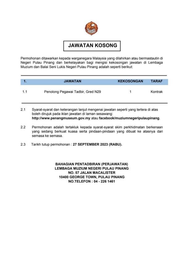 Iklan Jawatan Lembaga Muzium Negeri Pulau Pinang (LMNPP) Like serta Ikut Facebook Kami, follow Chanel WhatsApp Jawatan Kosong & Telegram Portal SPA9 untuk capaian pantas kekosongan jawatan daripada kami sekarang. Klik Jawatan Disini