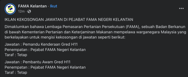Iklan Jawatan Lembaga Pemasaran Pertanian Persekutuan (FAMA)
