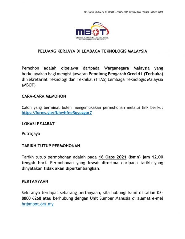 Iklan Jawatan Lembaga Teknologis Malaysia (MBOT) Like serta Ikut Facebook Kami, follow Chanel WhatsApp Jawatan Kosong & Telegram Portal SPA9 untuk capaian pantas kekosongan jawatan daripada kami sekarang.