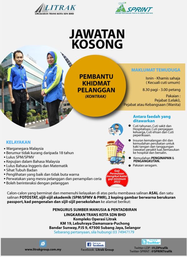 Iklan Jawatan LITRAK Group Like serta Ikut Facebook Kami, follow Chanel WhatsApp Jawatan Kosong & Telegram Portal SPA9 untuk capaian pantas kekosongan jawatan daripada kami sekarang.