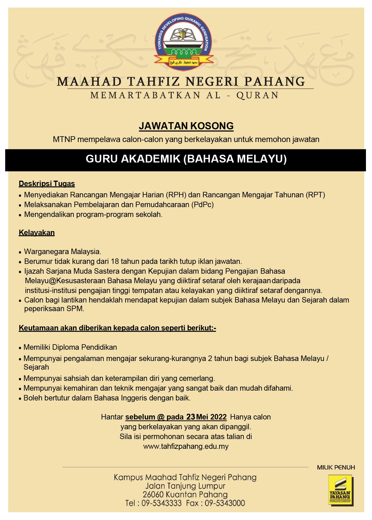 Iklan Jawatan Maahad Tahfiz Negeri Pahang Like serta Ikut Facebook Kami, follow Chanel WhatsApp Jawatan Kosong & Telegram Portal SPA9 untuk capaian pantas kekosongan jawatan daripada kami sekarang.