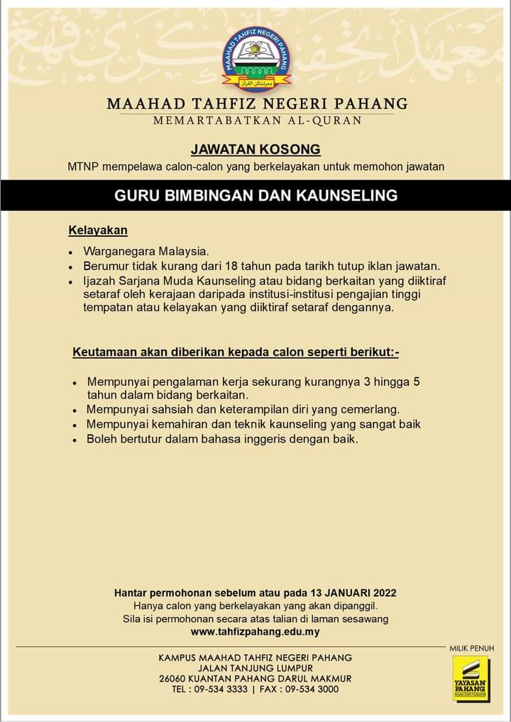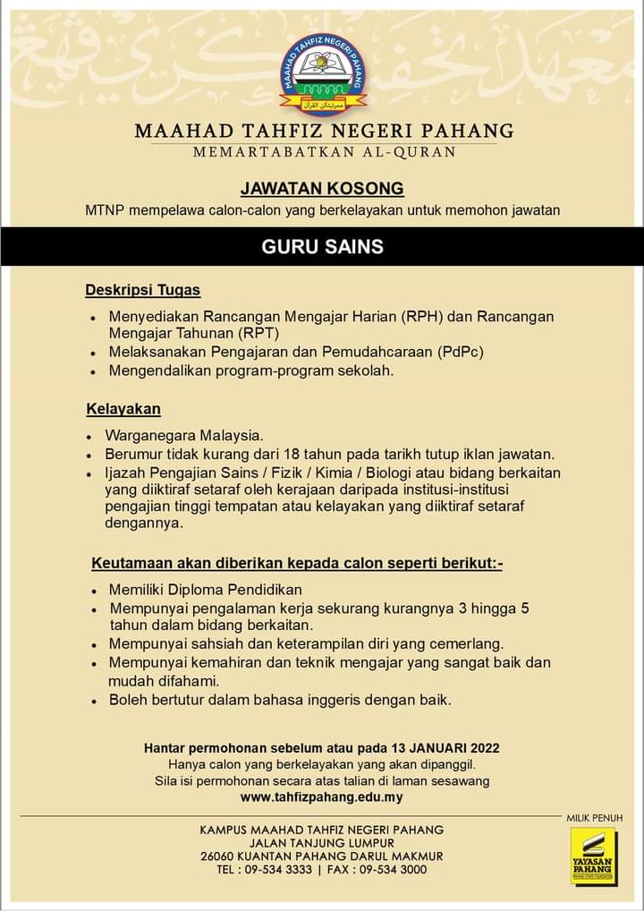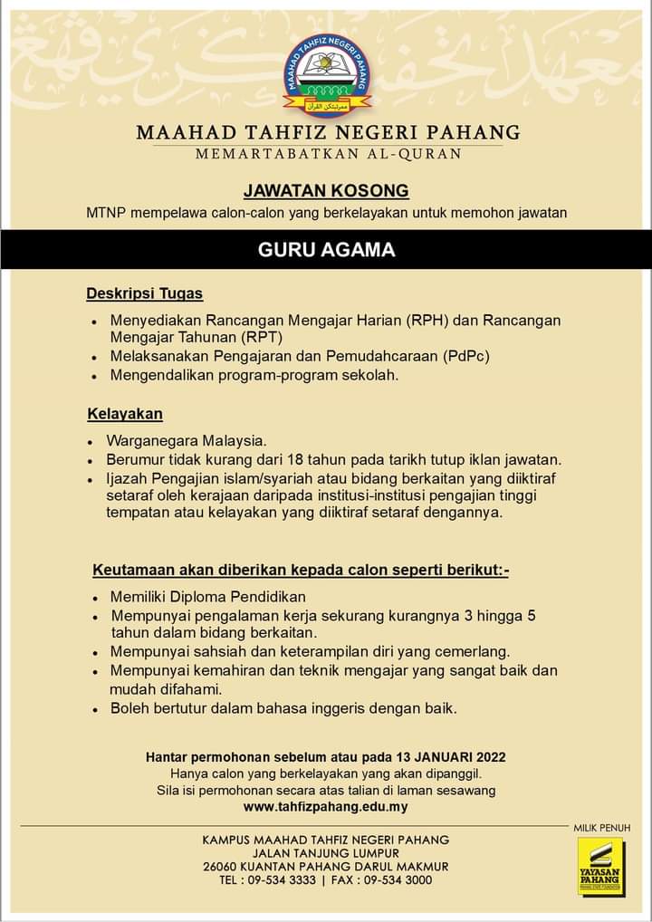 Iklan Jawatan Maahad Tahfiz Negeri Pahang