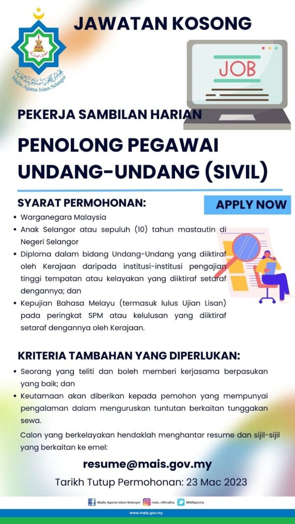 IKlan Jawatan Majlis Agama Islam Selangor (MAIS) Like serta Ikut Facebook Kami, follow Chanel WhatsApp Jawatan Kosong & Telegram Portal SPA9 untuk capaian pantas kekosongan jawatan daripada kami sekarang.