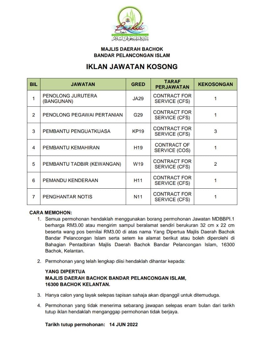 Iklan Jawatan Majlis Daerah Bachok Bandar Pelancongan Islam Like serta Ikut Facebook Kami, follow Chanel WhatsApp Jawatan Kosong & Telegram Portal SPA9 untuk capaian pantas kekosongan jawatan daripada kami sekarang. IKLAN PENUH JAWATAN