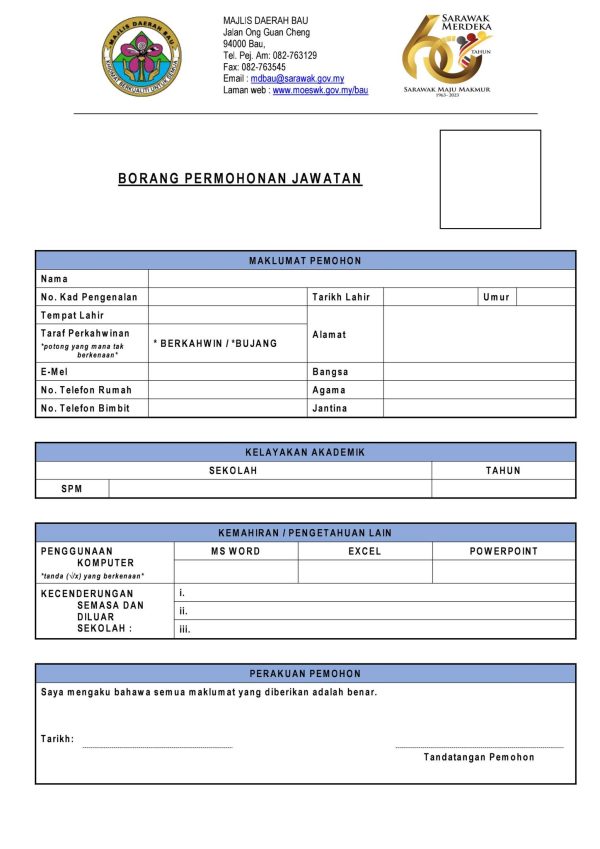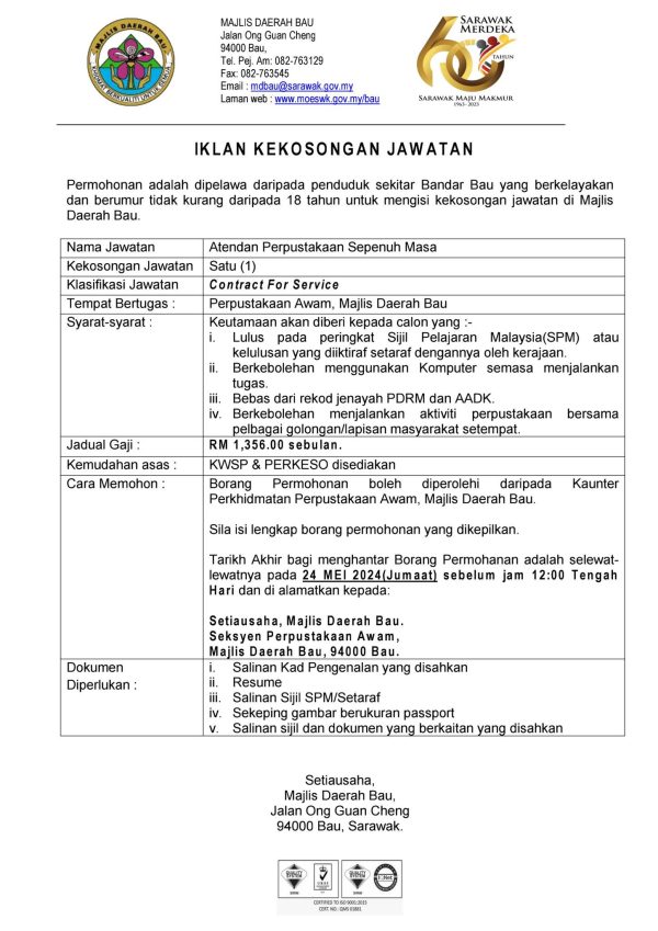 Iklan Jawatan Majlis Daerah Bau Like serta Ikut Facebook Kami, follow Chanel WhatsApp Jawatan Kosong & Telegram Portal SPA9 untuk capaian pantas kekosongan jawatan daripada kami sekarang.