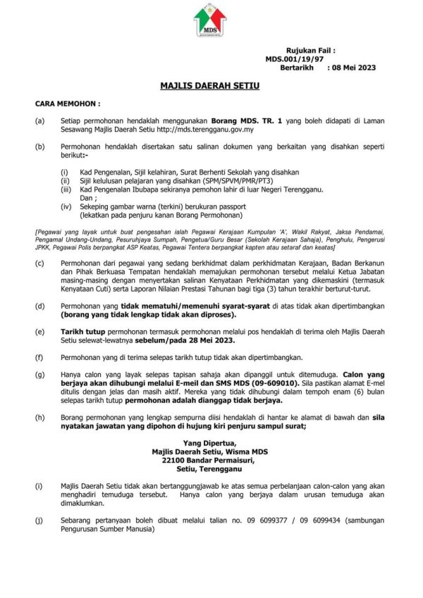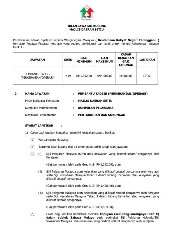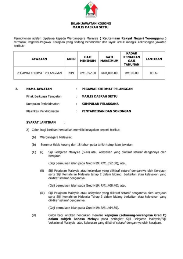 Iklan Jawatan Majlis Daerah Setiu Like serta Ikut Facebook Kami, follow Chanel WhatsApp Jawatan Kosong & Telegram Portal SPA9 untuk capaian pantas kekosongan jawatan daripada kami sekarang.