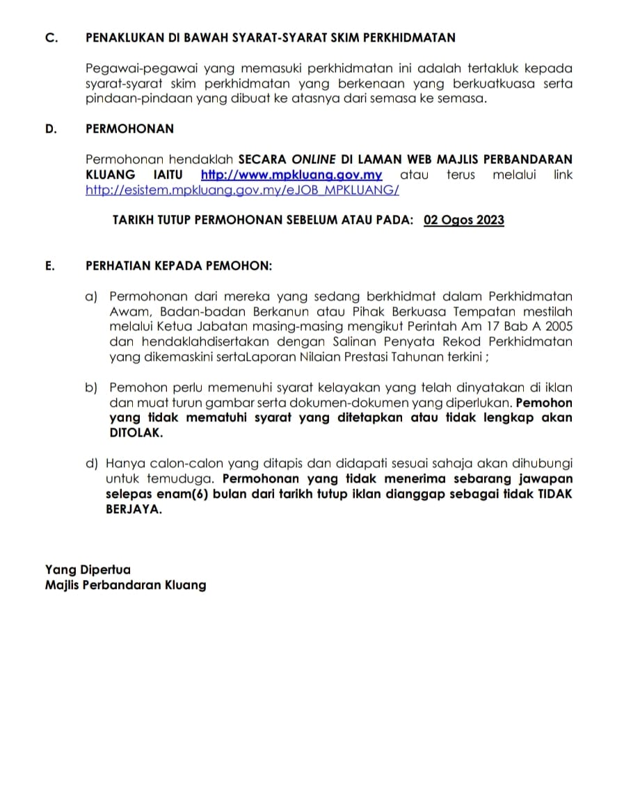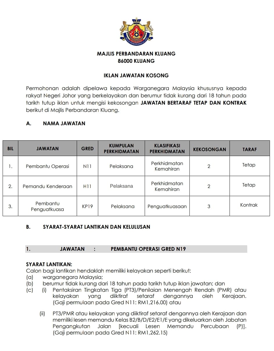 Iklan Jawatan Majlis Perbandaran Kluang (MPK) Like serta Ikut Facebook Kami, follow Chanel WhatsApp Jawatan Kosong & Telegram Portal SPA9 untuk capaian pantas kekosongan jawatan daripada kami sekarang. Klik Jawatan Disini