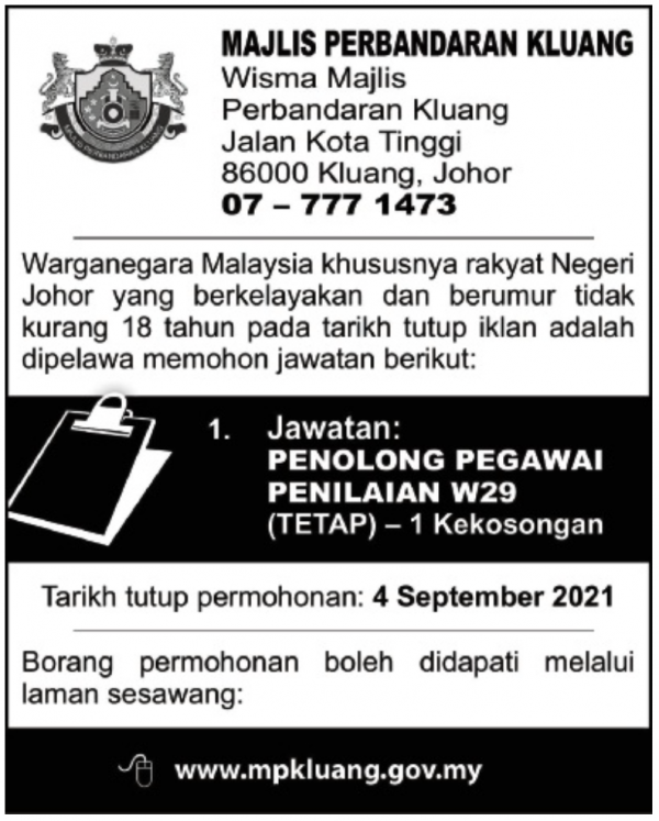 Iklan Jawatan Majlis Perbandaran Kluang (MPK) Like serta Ikut Facebook Kami, follow Chanel WhatsApp Jawatan Kosong & Telegram Portal SPA9 untuk capaian pantas kekosongan jawatan daripada kami sekarang.