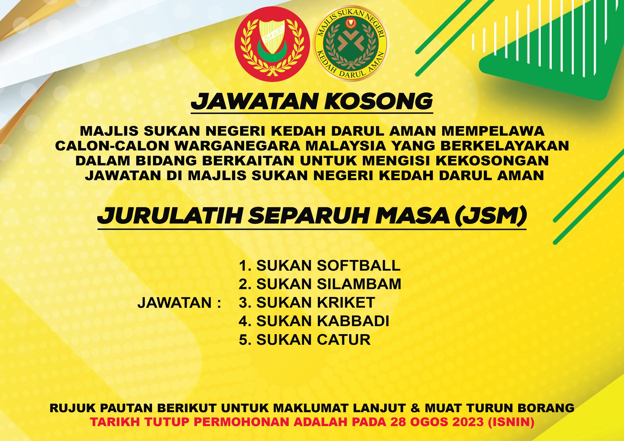 Iklan Jawatan Majlis Sukan Negeri Kedah Like serta Ikut Facebook Kami, follow Chanel WhatsApp Jawatan Kosong & Telegram Portal SPA9 untuk capaian pantas kekosongan jawatan daripada kami sekarang. Klik Jawatan Disini