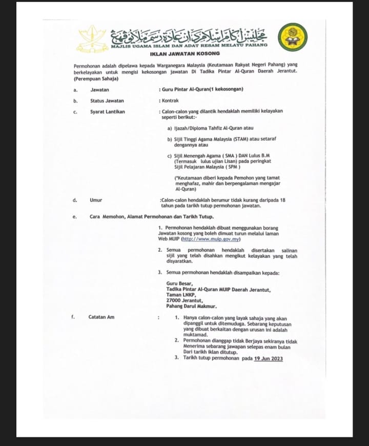 Iklan Jawatan Majlis Ugama Islam & Adat Resam Melayu Pahang (MUIP)