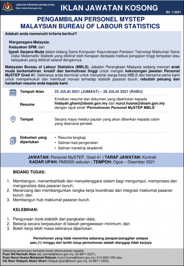 Iklan Jawatan Malaysian Bureau Of Labour Statics Like serta Ikut Facebook Kami, follow Chanel WhatsApp Jawatan Kosong & Telegram Portal SPA9 untuk capaian pantas kekosongan jawatan daripada kami sekarang.