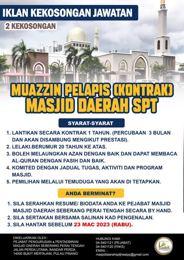 Iklan Jawatan Masjid Daerah Seberang Perai Tengah Like serta Ikut Facebook Kami, follow Chanel WhatsApp Jawatan Kosong & Telegram Portal SPA9 untuk capaian pantas kekosongan jawatan daripada kami sekarang.