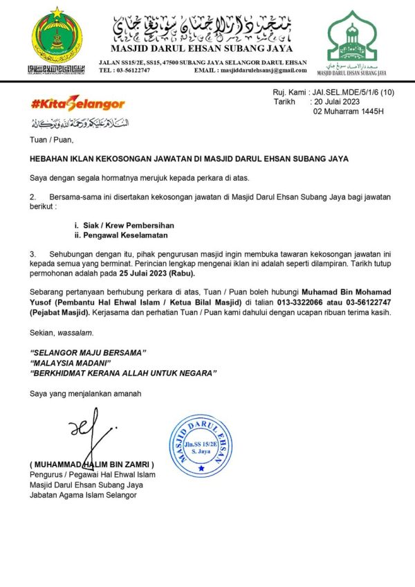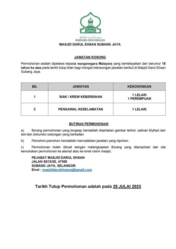 Iklan Jawatan Masjid Darul Ehsan Subang Jaya Like serta Ikut Facebook Kami, follow Chanel WhatsApp Jawatan Kosong & Telegram Portal SPA9 untuk capaian pantas kekosongan jawatan daripada kami sekarang.