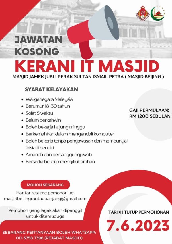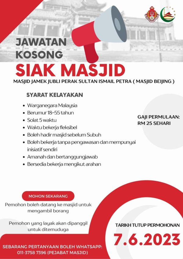 Iklan Jawatan Masjid Jamek Jubli Perak Sultan Ismail Petra Like serta Ikut Facebook Kami, follow Chanel WhatsApp Jawatan Kosong & Telegram Portal SPA9 untuk capaian pantas kekosongan jawatan daripada kami sekarang.